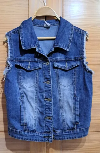 Chaleco vaquero con un estilo moderno y desenfadado. - Diseño sin mangas. - Acabado desgastado en los bordes. - Cierre de botones. - Dos bolsillos en el pecho. - Dos bolsillos inferiores.