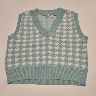 Chaleco de punto con un clásico estampado de pata de gallo. - Diseño sin mangas. - Cuello en pico. - Bajo y sisas con acabado de canalé. Color verde azulado (turquesa / menta claro). Nuevo a estrenar. Fue un regalo pero no me lo pongo. Talla S/M.