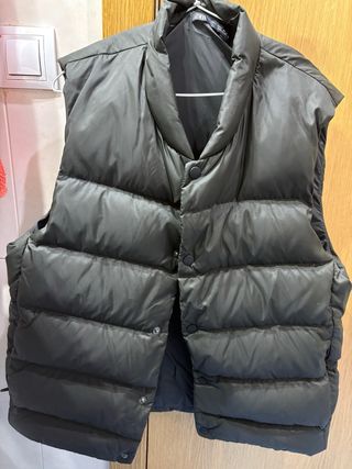 Chaleco acolchado Ultra Light Uniqlo de color gris. Es ligero y perfecto para usar en capas. - Cuello alto. - Cierre de cremallera frontal. - Dos bolsillos laterales con cremallera. Tiene una tara en la parte delantera derecha donde se ha cosido un poco (mirar las fotos antes de comprar).