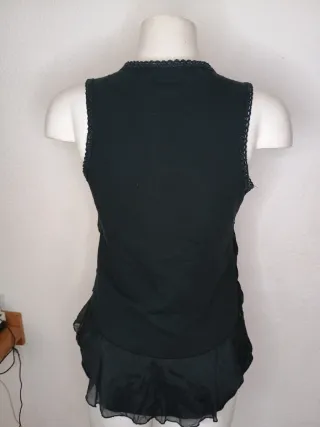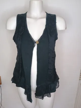 Chaleco de talla S/M con un diseño elegante y detalles de encaje. - Cierre con un botón dorado. - Bajo con volantes y tejido semitransparente. - Ribete de encaje en el cuello y las sisas.