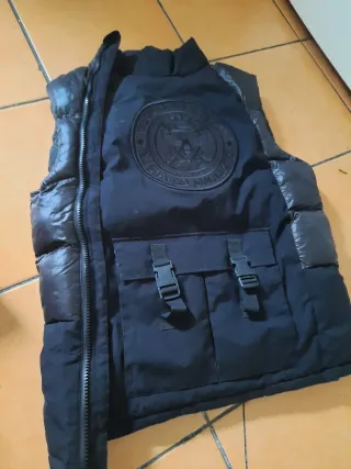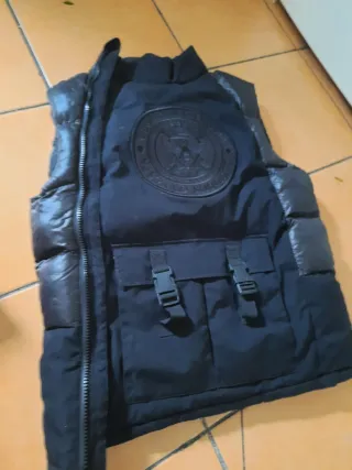 Chaleco acolchado con capucha. - Cierre de cremallera. - Bolsillos laterales. - Detalle de escudo en el pecho. - Calentito y cómodo. - No pesa. - Cremallera en muy buen estado. - Pone talla XXS pero es como una XS-S.