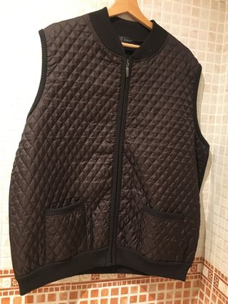 Chaleco acolchado en la parte delantera, color marrón con diseño de rombos, parte trasera es de punto. - Cierre de cremallera frontal. - Cuello y puños de canalé. - Dos bolsillos delanteros.