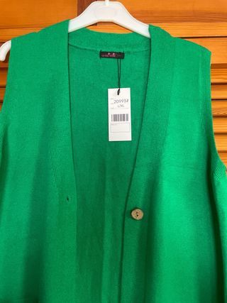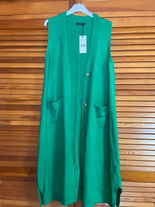 Chaleco de punto largo en color verde. Es una prenda versátil y cómoda. Talla L/XL. Se encuentra nuevo con la etiqueta. - Diseño sin mangas. - Cierre de botones. - Dos bolsillos delanteros.
