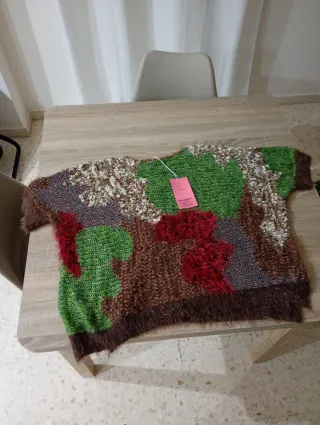 Chaleco de lana con un diseño patchwork único. - Tejido suave y cálido. - Combinación de texturas y colores. - Ideal para añadir un toque original a tu atuendo.