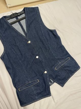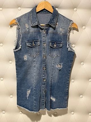 Chaleco vaquero con un estilo moderno y desgastado. - Diseño sin mangas. - Bolsillos en el pecho. - Cierre de botones. - Detalles rasgados.
