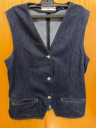 Chaleco tejano de corte clásico, perfecto para añadir un toque informal a cualquier atuendo. - Cierre de botones. - Dos bolsillos en el pecho con solapa y botón. - Dos bolsillos laterales (por la parte interior también se pueden usar los bolsillos). - Cuello camisero.