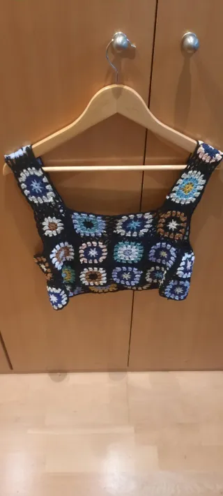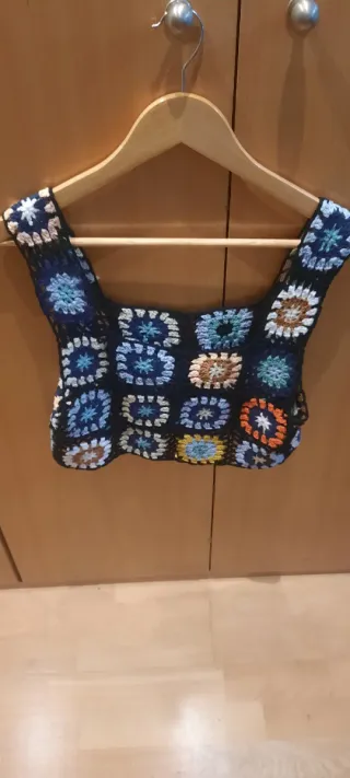 Original chaleco tejido a mano con un diseño de cuadrados. - Motivos de ganchillo en varios tonos. - Diseño de tirantes anchos.