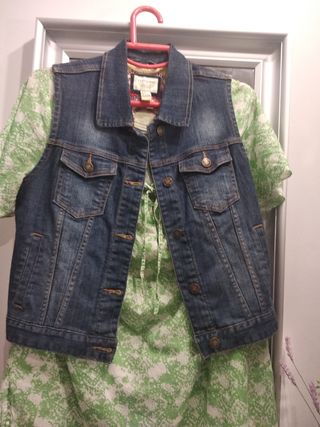 Chaleco vaquero largo de H&M en color beige. Un básico versátil para cualquier look. - Diseño sin mangas. - Dos bolsillos en la parte delantera. - Cierre de botones. - Bajo con aberturas laterales. Es una talla S oversize, sirve para M-L tambien