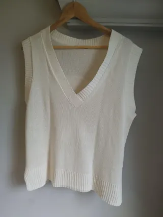 Chaleco de punto fino en color beige, con cuello en pico. - Stradivarius, talla S,vaunque da para M y L, es overside - Diseño sin mangas. - Bajo y cuello con acabado acanalado.
