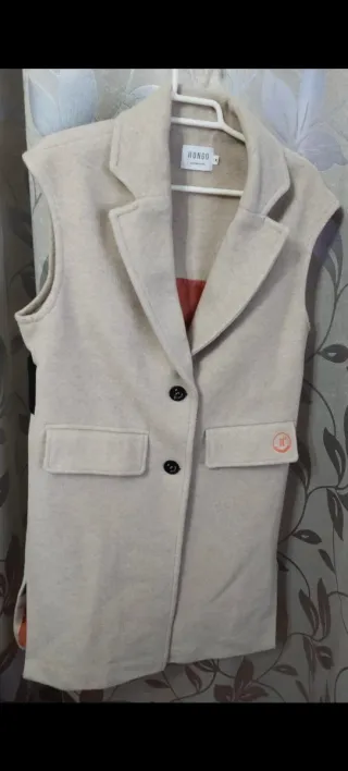 Chaleco largo de la marca Hongo en color beige. Tiene un diseño elegante y moderno. - Cierre con dos botones. - Dos bolsillos delanteros. - Detalle de logo en uno de los bolsillos.