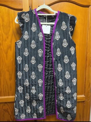 Chaleco acolchado con un bonito estampado paisley. - Diseño sin mangas. - Ribete en contraste morado. - Acolchado interior negro.