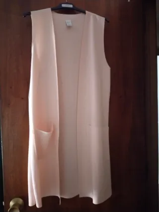 Chaleco rosa palo, largo de tela ligera, ideal para añadir un toque elegante a cualquier atuendo. - Diseño abierto sin cierre. - Dos bolsillos frontales. - Corte recto y fluido.