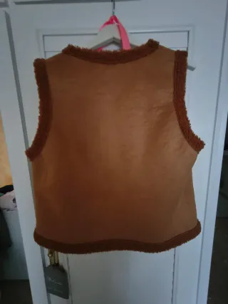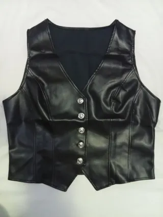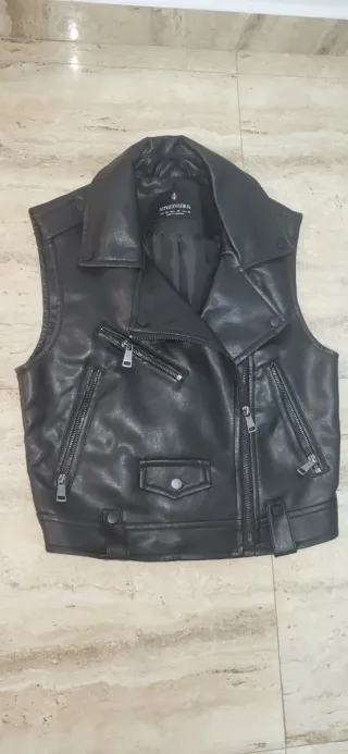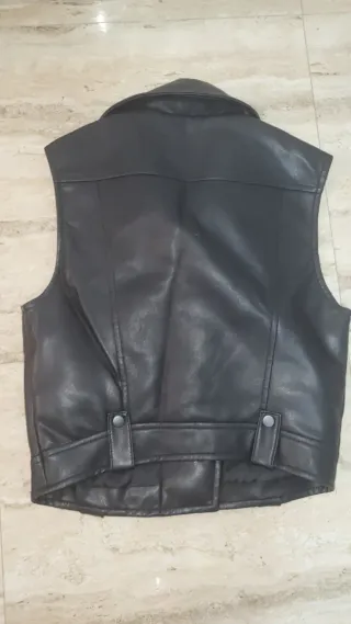 Chaleco de efecto piel con un diseño moderno y versátil. - Cierre de cremallera. - Bolsillos frontales con cremallera. - Bolsillo de solapa con botón a presión. Solo 1 uso Talla xs