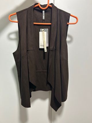 Chaleco de ante en color marrón, con un diseño abierto y moderno. - Corte asimétrico. - Tejido suave al tacto. - Ideal para superponer sobre otras prendas.