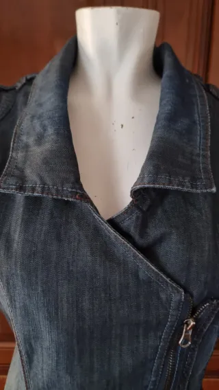 Chaleco vaquero de estilo motero para mujer. Presenta un diseño cruzado con cremallera. - Cuello solapa. - Sin mangas. - Detalle de bolsillos frontales.