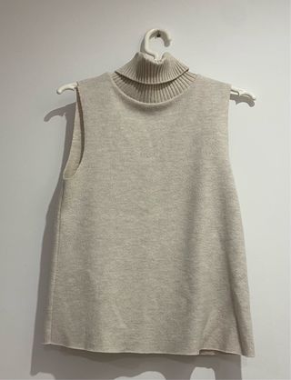 Chaleco de punto con cuello alto, ideal para el invierno. Su diseño sin mangas lo hace versátil para combinar. - Tejido suave y cálido. - Cuello de canalé. - Corte recto.