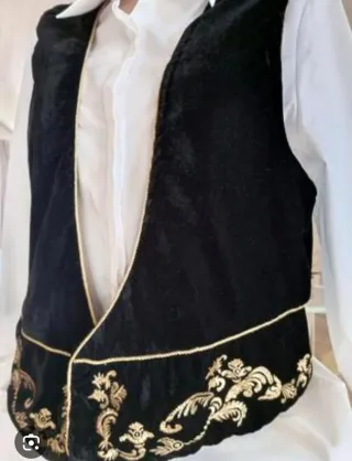 Elegante chaleco de terciopelo con detalles bordados. - Diseño sin mangas. - Ribete dorado. - Adorno floral en el bajo.
