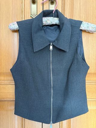 Chaleco elegante sin estrenar, perfecto para añadir un toque chic a tu look. - Diseño sin mangas. - Cierre de cremallera frontal. - Cuello estilo camisa.