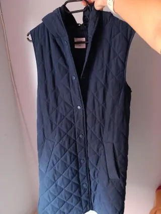 Chaleco largo acolchado con capucha. - Cierre de botones a presión. - Dos bolsillos laterales. - Diseño acolchado con rombos. - Usado un par de veces.