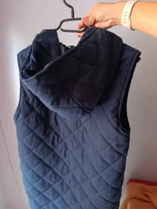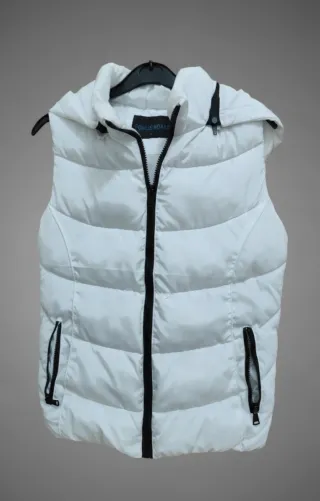 Chaleco acolchado con capucha y cremallera frontal. Relleno medio acrílico, talla S/M. - Diseño sin mangas. - Dos bolsillos laterales con cremallera. - Capucha integrada.