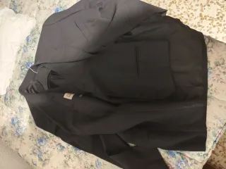 En muy buen estado. Botones forrados, uno de ellos un poco gastado. No conserva etiqueta de composición, posiblemente lana. Dos falsos bolsillos, color verde caza muy oscuro con ribete en negro. Medidas: hombros 40 cm, entre axilas 50 cm, largo 64,5 cm.