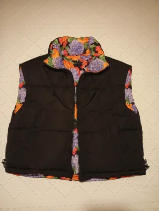Chaleco acolchado con un diseño reversible y corte oversize. Presenta un estampado floral vibrante en el interior en tonos malva, naranja y verde sobre fondo negro. Incorpora dos bolsillos delanteros, cremallera frontal y cintas para ajustar la parte inferior al cuerpo.