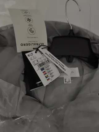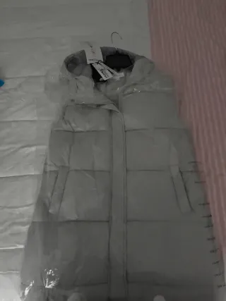 Chaleco acolchado gris, nuevo y sin estrenar. - Diseño moderno con capucha. - Cierre frontal. - Bolsillos laterales.