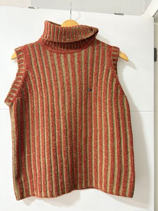 Chaleco de punto de Tommy Hilfiger con cuello alto y diseño de rayas verticales. Una prenda versátil para añadir a tu armario. - Diseño de rayas en tonos beige y rojo. - Cuello alto acanalado. - Sin mangas.
