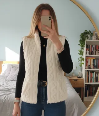 Chaleco de pelo sintético en color beige, ideal para añadir un toque de estilo. - Diseño sin mangas. - Tacto suave y peludo.