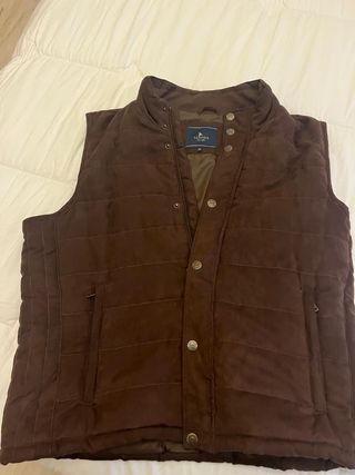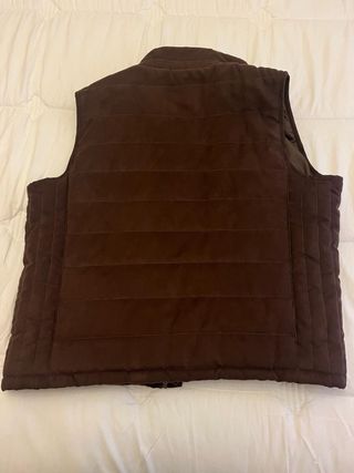 Chaleco de ante serraje en color marrón. Diseño acolchado con cuello alto y cierre de botones. - Ancho 60cm y largo 65cm - Bolsillos laterales con cremallera. - Detalle de pespuntes.