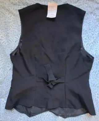 Chaleco de vestir de color negro, ideal para uniformes o eventos. - Cuello en V. - Cierre de botones. - Dos bolsillos frontales. - Tiras ajustables en la parte trasera.
