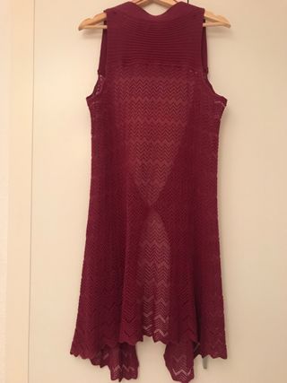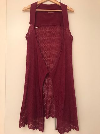Chaleco Trucco, va suelto en la parte delantera, no lleva para abrocharse. Color vino. Largo detras: 96cm Largo picos delante:105cm