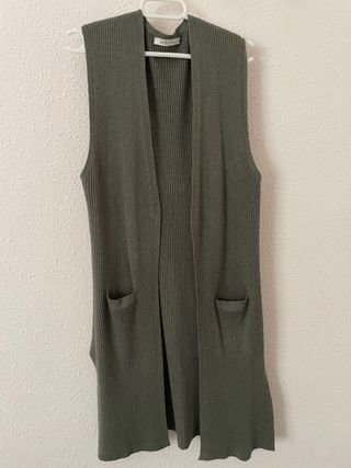 Preciosa chaleco de punto de color verde oliva para mujer. - Diseño de canalé. - Largo. - Sin mangas. - Dos bolsillos funcionales.