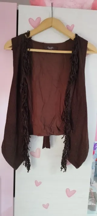 Chaleco de mujer con un diseño único y detalles llamativos. Abierto no lleva cierre, marca talla 40 hay medidas en las fotos - Color marrón. - Adornado con flecos en el cuello y bajo. - Posee un lazo en la espalda para ajustar. - Tejido con perforaciones en forma de flor.