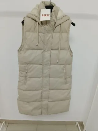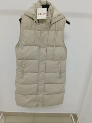 Chaleco acolchado de polipiel en color beige, con un diseño moderno y versátil. - Capucha integrada. - Cierre de botones a presión. - Bolsillos frontales. - Tejido polipiel. Medidas 49 cm de largo desde el hombro hasta abajo y 46 cm de ancho.