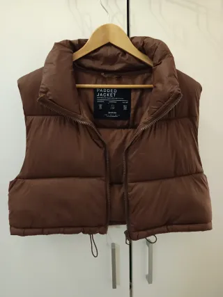 Chaleco crop de Stradivarius en color marrón, talla L. Diseño acolchado, corto y moderno. - Cuello alto. - Cierre de cremallera. - Bajo ajustable con cordón. Usado un par de veces, en perfectas condiciones 😊🛍️