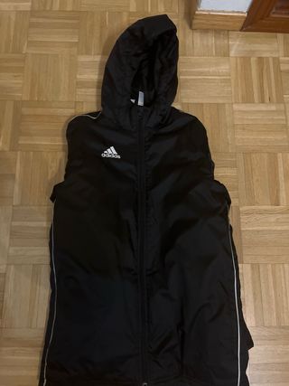Chaqueta deportiva Adidas en color negro, con capucha, talla l de niños equivalente a 13/14 años. - Cierre de cremallera frontal. - Ribete blanco en los laterales. - Logo de Adidas en el pecho.