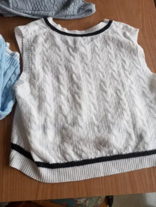 Conjunto de dos chalecos de punto con diseño trenzado. - Chaleco azul con cuello en V. - Chaleco blanco con detalles de rayas negras en el cuello y bajo.