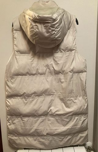 Chaleco largo acolchado con capucha. - Cierre de cremallera. - Dos bolsillos laterales con botón. - Cordones ajustables en la capucha. -Color beige.