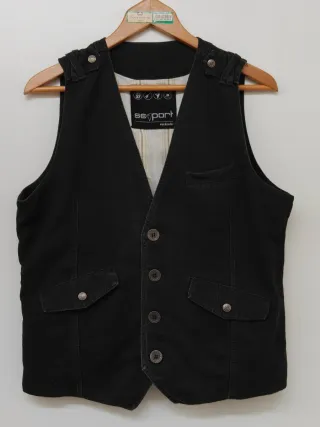 Elegante chaleco de sastre en color negro con finas líneas verticales. Es de talla L. - Diseño clásico y versátil. - Cierre con botones. - Confeccionado en tejido de calidad. Chaleco de sastre, de vestir de traje, con lineas verticales ( puntadas azules) y espalda de tela raso satinada, con cinturón en la parte de atrás. Cierre de botón y corchete, escote profundo, elegante o informal Medidas en las fotografías: Contorno de pecho 50 cm, en la espalda un cm mas, es decir 102 cm. Tiene en las alas interiores rozaduras de la faja como se ve en la última fotografía. Que no afecta en nada porque va dentro. Hago descuentos por lotes