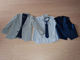 Conjunto de vestir para niño de 7 u 8 años, ideal para eventos especiales. Incluye americana, camisa, chaleco y corbata. Usado una única ocasión. También se vende por separado: chaleco 30€, chaqueta 18€, camisa 6€ y corbata 6€ - Americana gris. - Camisa azul claro. - Chaleco azul con estampado. - Corbata azul a juego.