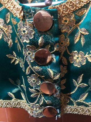 Este espectacular chaleco estilo marroquí es perfecto para disfraces o eventos especiales. Su diseño intrincado y sus vibrantes colores lo hacen destacar. - Tejido brocado con motivos florales. - Ribete dorado en cuello y bajo. - Cierre frontal con botones. Confeccionado a mano por modista. Es espectacular. Sin estrenar