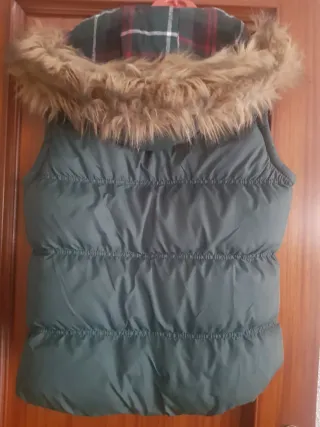 Chaleco acolchado con capucha y detalles de pelo sintético. - Cierre de cremallera. - Dos bolsillos laterales con solapa. - Cierre de toggles en la parte delantera. - Forro interior a cuadros.