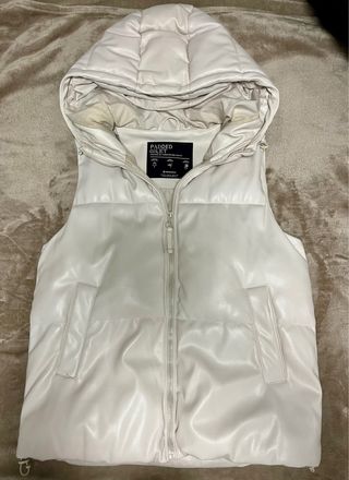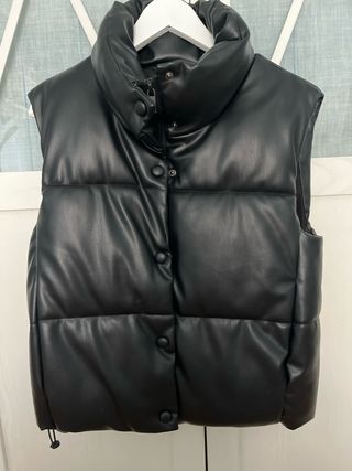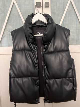 Chaleco acolchado de Zara con acabado efecto piel. - Cuello alto. - Cierre de cremallera y botones a presión. - Bolsillos laterales. - Abrigado