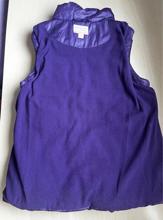 Chaleco acolchado de color morado con un detalle de flor decorativa. - Cierre de cremallera. - Cuello alto. - Bolsillos laterales.