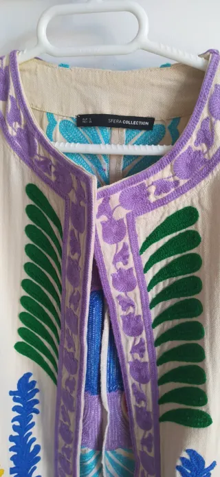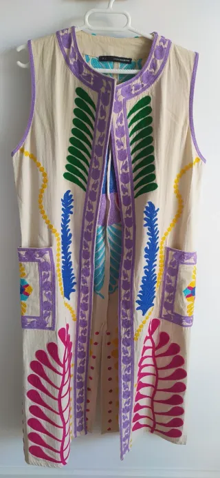 Chaleco largo con un diseño muy colorido y bordados. - Bordados florales y geométricos. - Abertura frontal. - Bolsillos delanteros. - Edición limitada