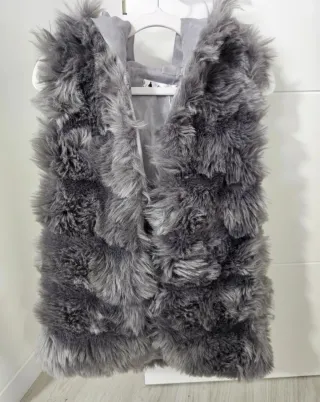 Chaleco de pelo sintético en color gris. Es una prenda muy suave y cálida, perfecta para añadir un toque de estilo a cualquier conjunto. - Diseño sin mangas. - Cierre frontal. - Forro interior.