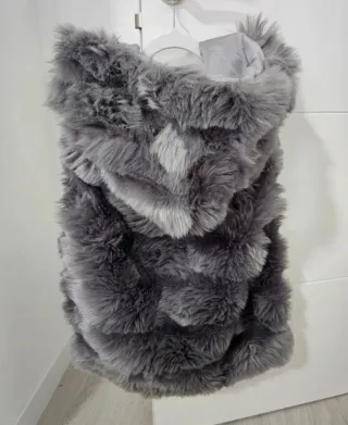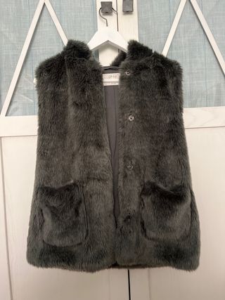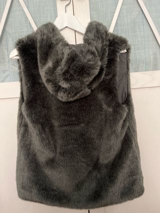 Talla 13-14 años Chaleco de pelo en tono gris. - Cierre de botones metálicos. - Dos bolsillos delanteros y capucha.