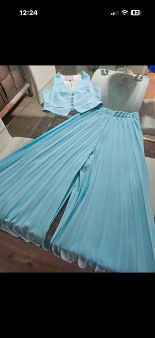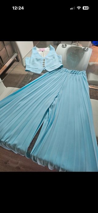 Conjunto de dos piezas: chaleco y pantalón, usado 1 vez, actual, es espectacular , está impecable , en la etiqueta pone talla 40 pero equivale a una 36 ya que es firma Italiana - Chaleco con cuello - Pantalón ancho con pliegues