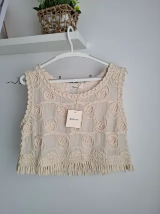 Precioso chaleco estilo boho bohemio en color crema, con detalles bordados circulares y flecos en el bajo. Totalmente nuevo con etiqueta, talla única que corresponde a S/M (la mujer de la foto tiene S). Perfecto para llevar encima de mangas largas o llevarlo solo. Hago envíos o entrego en mano